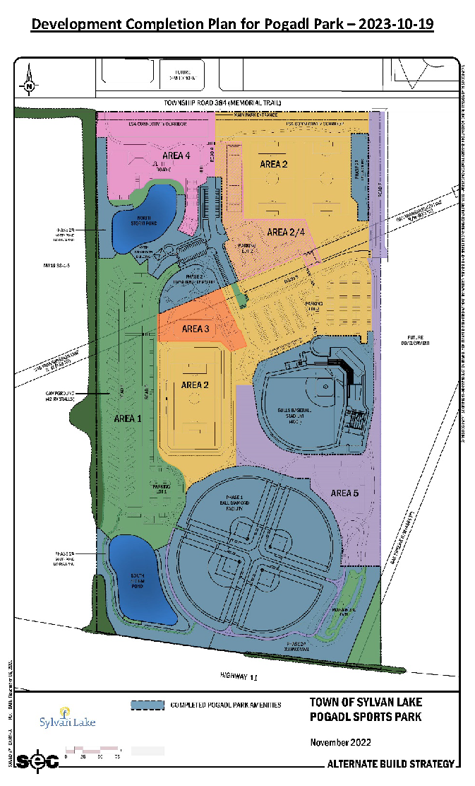 - Multipurpose field, 4 Pickleball courts, 2 natural grass soccer fields, irrigation, soft landscaping, Road B, Road C, Parking Lot 3, Operations yard, road and parking lot streetlighting